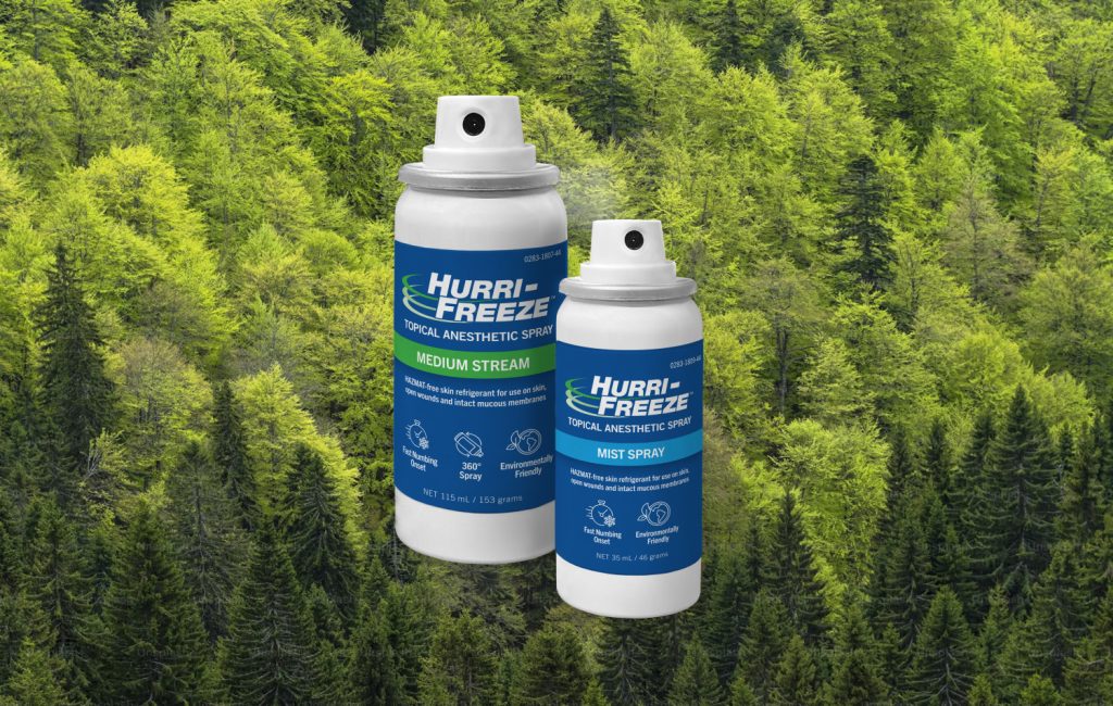 Hurri-Freeze offers significant advancement in topical anesthetics with its unique formulation, providing a colder performance and a Global Warming Potential (GWP) that is 99% lower than traditional HFC topical anesthetic sprays.
