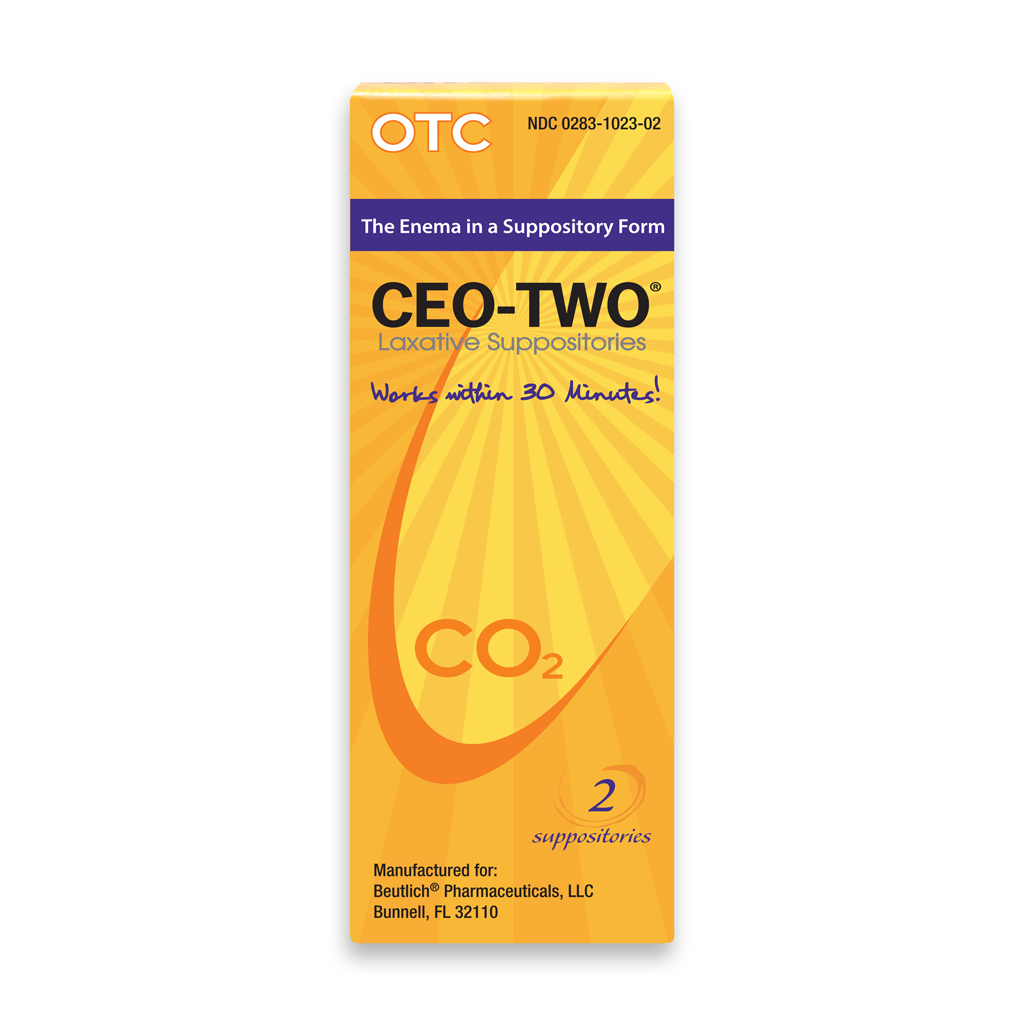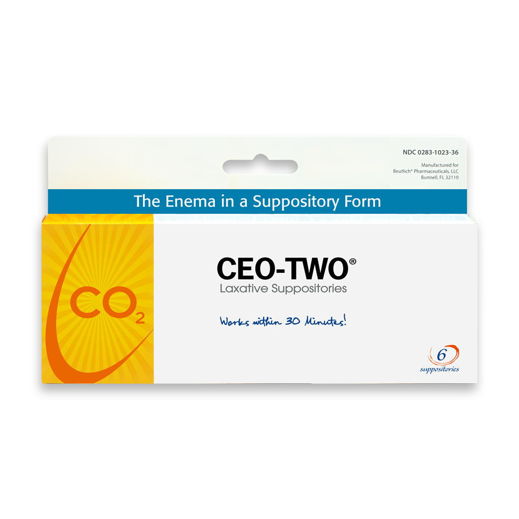 CEO-TWO® Laxative Suppositories combine Sodium Bicarbonate and Potassium Bitartrate in a Polyethylene Glycol Base. Upon insertion into the rectum, the pre-moistened suppository reacts with the moisture present to produce carbon dioxide gas. This CO2 gas gently expands the lower bowel and creates a reflex stimulation, resulting in an urge to empty the lower bowel within 30 minutes. Moreover, there is no chemical stimulation to the bowel, no painful cramping, no diarrhea, and rarely a second urge to defecate.